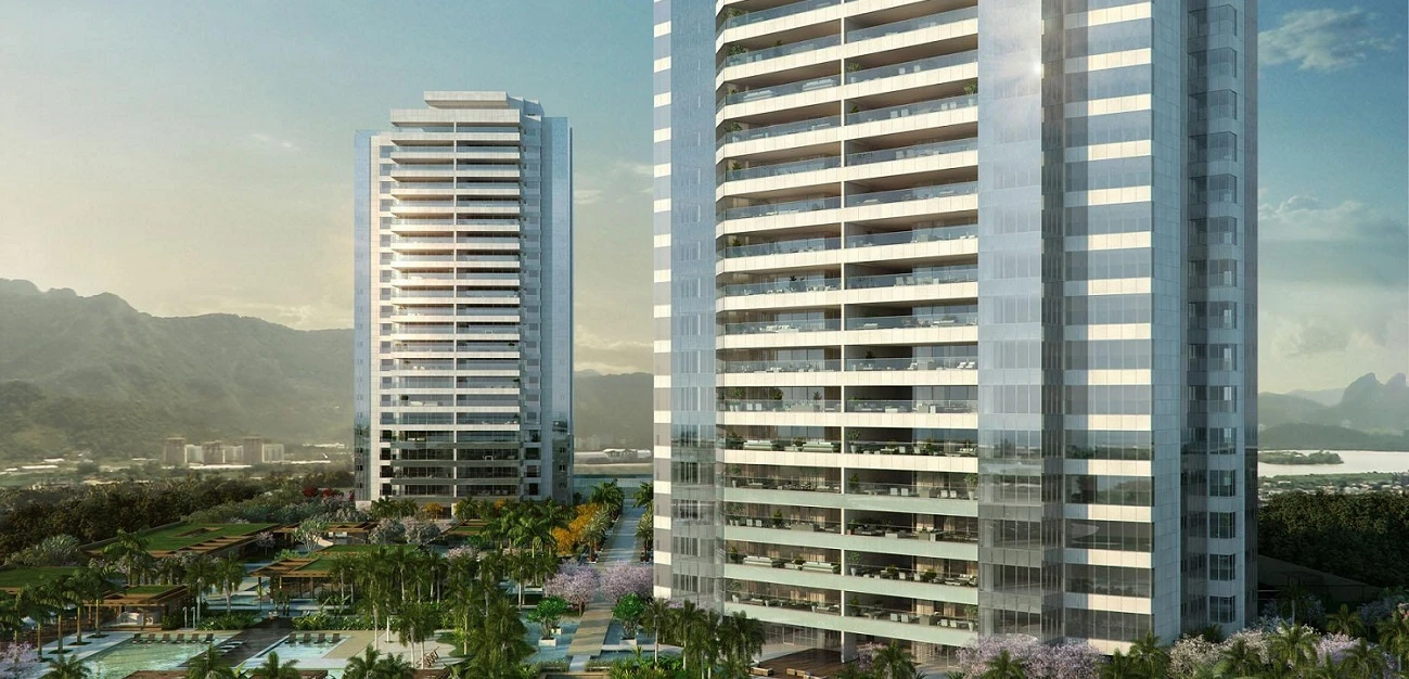 A fachada, em pele de vidro e mármore, proporciona a sensação de levitar sobre uma paisagem espetacular. Inspirado na arquitetura contemporânea de grandes ícones internacionais, o pórtico de entrada é um enorme painel metálico rendilhado em composição com caixas de vidro que permeiam iluminação e ventilação.